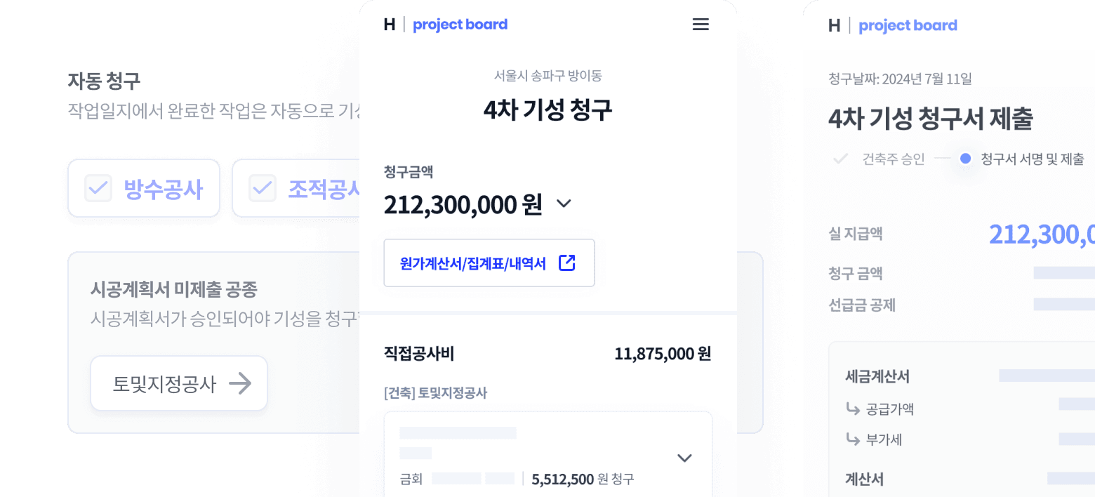공정보고서에 따라 공정률이 산정되며, 기성청구서 생성 및 청구가 가능해요
